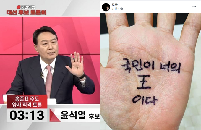 국민의힘 대권 주자인 윤석열 전 검찰총장이 손바닥에 왕王 자를 쓴 채 tv 토론회에 나서 논란이 일자 조국 전 법무부 장관이 무당층無黨層이 등을 돌려 무당巫堂의 도움을 구했다라고 비꼬았습니다.